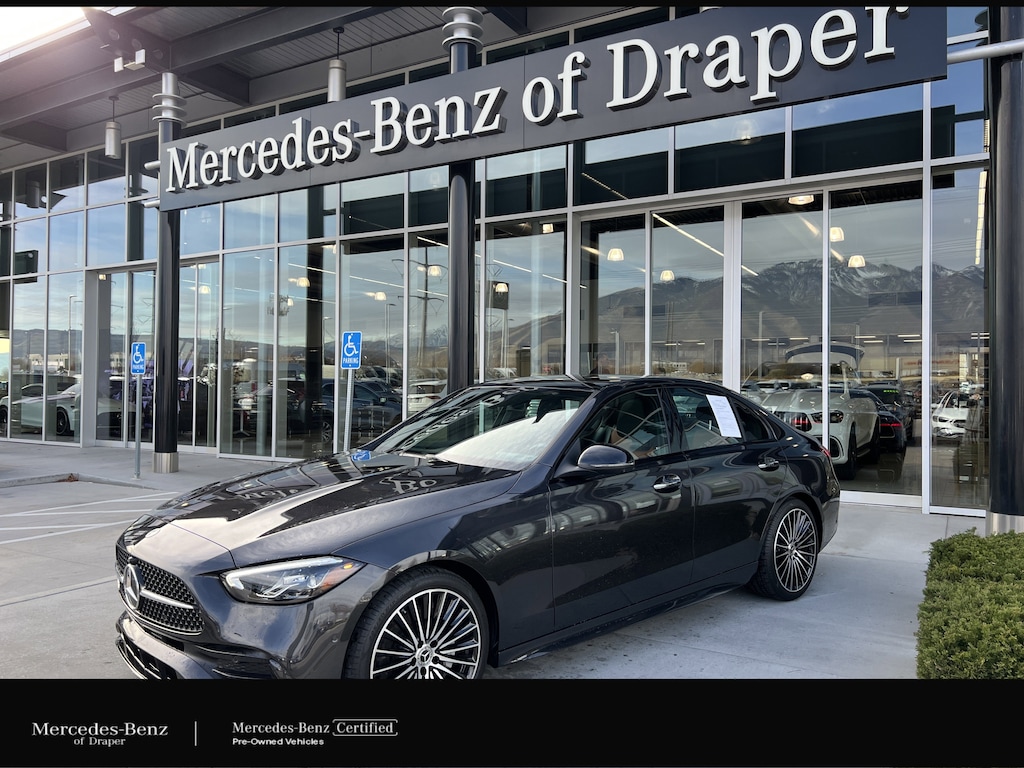 Mercedes-Benz of Draper proudly offers this 2024 Black Mercedes-Benz C 300 RWD . It is well equipped and includes these features and benefits: Mercedes-Benz Certified Pre-Owned Certified, 11.9 Center Touchscreen Display, 18 5-Spoke Wheels, 4-Wheel Disc Brakes, 5 Speakers, ABS brakes, Air Conditioning, Alloy wheels, AM/FM radio: SiriusXM, Anti-whiplash front head restraints, Apple CarPlay®/Android Auto®, Auto High-beam Headlights, Auto tilt-away steering wheel, Auto-dimming door mirrors, Auto-dimming Rear-View mirror, Automatic temperature control, Brake assist, Bumpers: body-color, Child-Seat-Sensing Airbag, Compass, Delay-off headlights, Driver door bin, Driver vanity mirror, Dual front impact airbags, Dual front side impact airbags, Electronic Stability Control, Emergency communication system: Mercedes-Benz Emergency Call Service, Exterior Parking Camera Rear, Four wheel independent suspension, Front anti-roll bar, Front Bucket Seats, Front Center Armrest, Front dual zone A/C, Front reading lights, Fully automatic headlights, Garage door transmitter: HomeLink, Genuine wood dashboard insert, Head restraints memory, Heated door mirrors, Heated front seats, Illuminated entry, Knee airbag, Leather steering wheel, Low tire pressure warning, Lumbar Support, MB-Tex Upholstery, Memory seat, Occupant sensing airbag, Outside temperature display, Overhead airbag, Overhead console, Panic alarm, Passenger door bin, Passenger vanity mirror, Power adjustable front head restraints, Power door mirrors, Power driver seat, Power Heated Front Seats w/Memory, Power moonroof, Power passenger seat, Power steering, Power windows, Premium audio system: MBUX, Radio data system, Radio: FrontBass 5-Speaker Audio System, Rain sensing wipers, Rear anti-roll bar, Rear fog lights, Rear reading lights, Rear seat center armrest, Rear window defroster, Remote keyless entry, Security system, SiriusXM Satellite Radio, Speed control, Speed-sensing steering, Split folding rear seat, Steering wheel memory, Steering wheel mounted audio controls, Tachometer, Telescoping steering wheel, Tilt steering wheel, Traction control, Trip computer, Turn signal indicator mirrors, Variably intermittent wipers, and Weather band radio.
