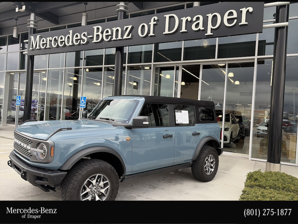 Mercedes-Benz of Draper proudly offers this 2023 Area 51 Ford Bronco Badlands 4WD . It is well equipped and includes these features and benefits: 4-Wheel Disc Brakes, 7 Speakers, ABS brakes, Air Conditioning, AM/FM radio: SiriusXM with 360L, AM/FM Stereo, Auto High-beam Headlights, Brake assist, Compass, Delay-off headlights, Driver door bin, Driver vanity mirror, Dual front impact airbags, Dual front side impact airbags, Electronic Stability Control, Emergency communication system: 911 Assist, Exterior Parking Camera Rear, Front anti-roll bar, Front Bucket Seats, Front Center Armrest, Front reading lights, Front wheel independent suspension, Fully automatic headlights, Heated door mirrors, Illuminated entry, Integrated roll-over protection, Low tire pressure warning, Occupant sensing airbag, Outside temperature display, Overhead airbag, Overhead console, Panic alarm, Passenger door bin, Passenger vanity mirror, Power door mirrors, Power steering, Power windows, Radio data system, Remote keyless entry, Security system, SiriusXM Radio w/360L, Speed control, Split folding rear seat, Steering wheel mounted audio controls, SYNC 4, Tachometer, Telescoping steering wheel, Tilt steering wheel, Traction control, Trip computer, Variably intermittent wipers, and Wheels: 17 Black High Gloss-Painted Aluminum.